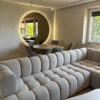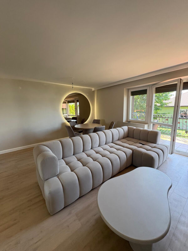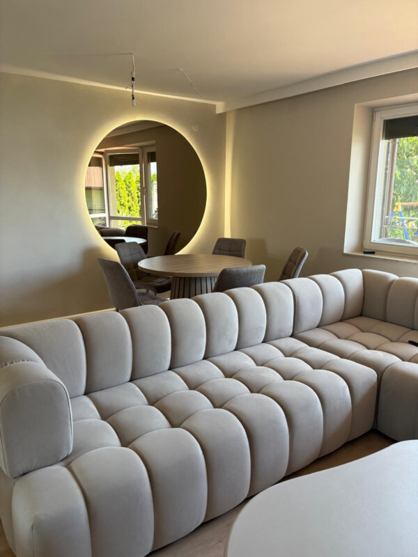 Puchata sofa narożna. Silikonowy puch, wysoko-elastyczne pianki HR oraz sprężyny kieszeniowe składają się na wygodę sofy. Tkanina hydrofobowa, łatwa w czyszczeniu odpowiednia do domów z dziećmi i zwierzętami.