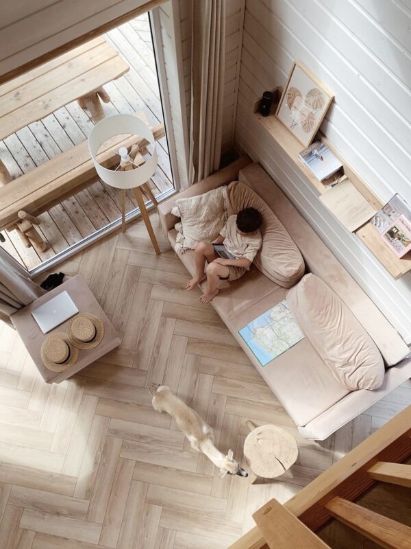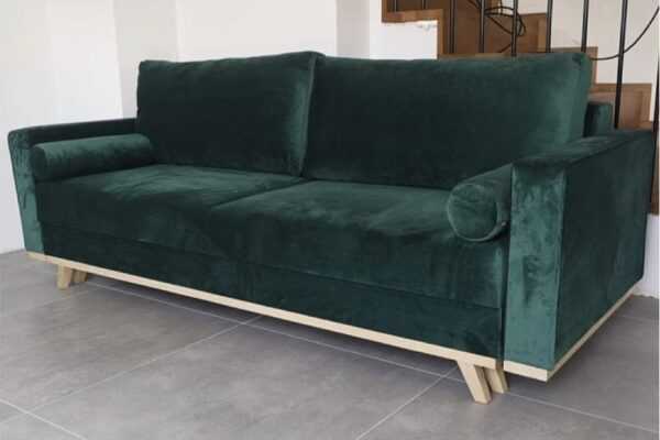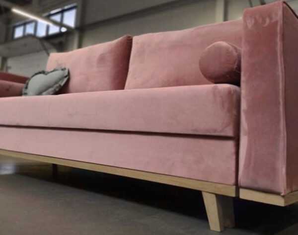 Absolutny bestseller. Dębowa listwa w połączniu z hydrofobową tkaniną velvet. Sofa posiada funkcję spania – 140 x 190 cm.
