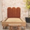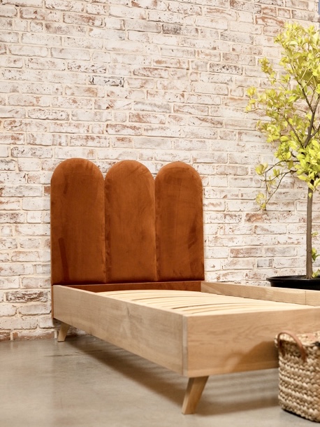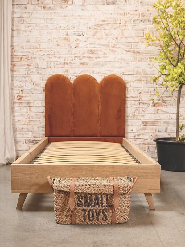 Łóżeczko do pokoju dziecinnego ze słodkim biszkoptowym zagłówkiem. Przyjemne oparcie i tkanina dla pleców dziecka oraz rodziców podczas wieczornego czytania bajek. Dębowa rama o zaokrąglonych rogach. Łóżko w klasycznym wymiarze pod materac 90 cm.