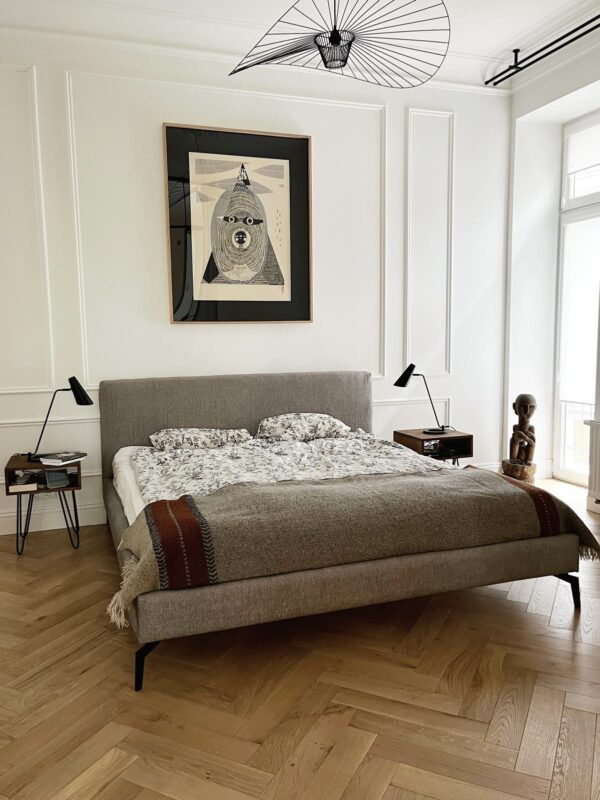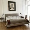 Minimalistyczne łóżko wraz ze stelażem pod materac. Silikonowy puch oraz wysoko elastyczna pianka. Tkanina – posiadająca właściwości hydrofobowe. Łóżko dopasowane pod materac 160x200cm.