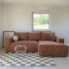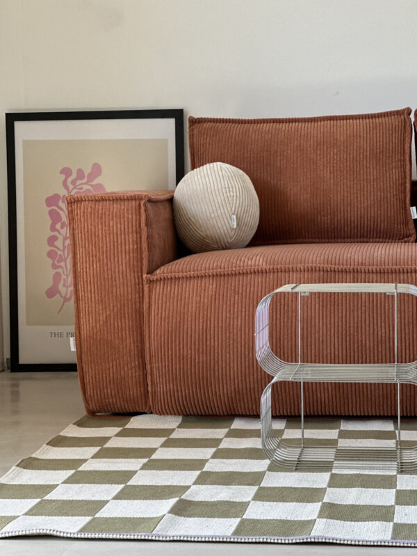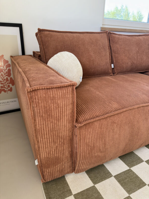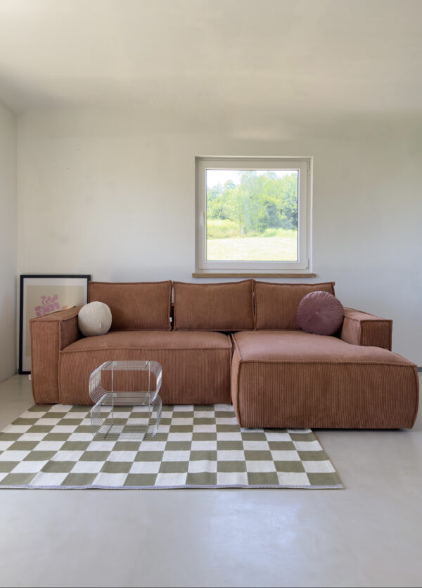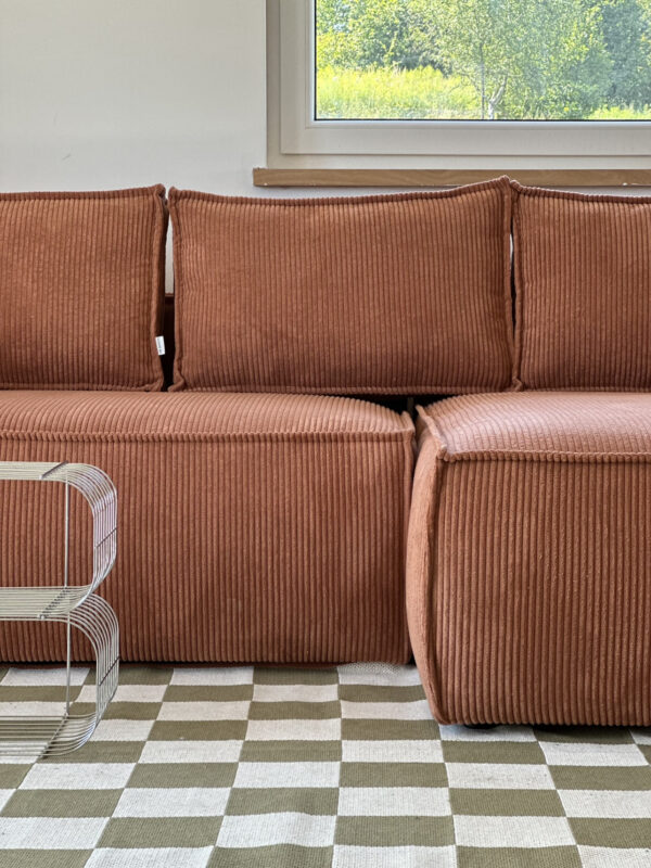 Sofa narożna z funkcją spania w tkaninie sztruksowej – siostra naszych bestsellerowych modeli JOSEPHINE oraz STEFANIE. Must have wnętrz ostatniego czasu. Zaokrąglone rogi wprowadzają Pinterestowy charakter. Silikonowy puch, wysoko-elastyczne pianki oraz sprężyny kieszeniowe składają się na wygodę sofy.