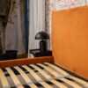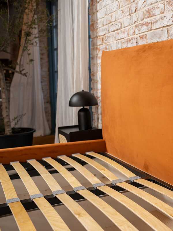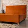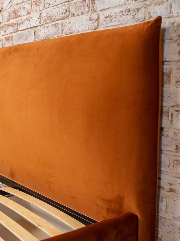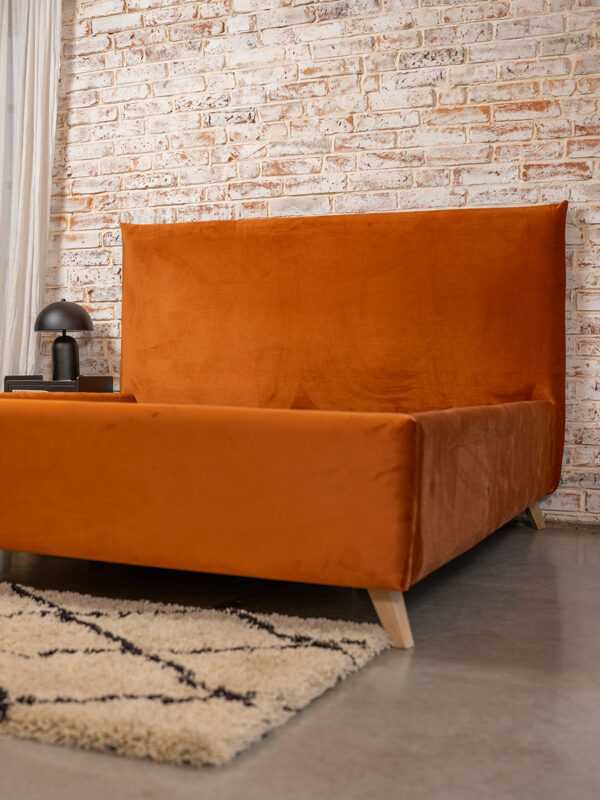 Łóżko z zagłowiem w kształcie puchatej poduszki. Silikonowy puch oraz wysoko elastyczna pianka. Bestsellerowa ruda tkanina – posiadająca właściwości hydrofobowe. Łóżko dopasowane pod materac 160x200cm.